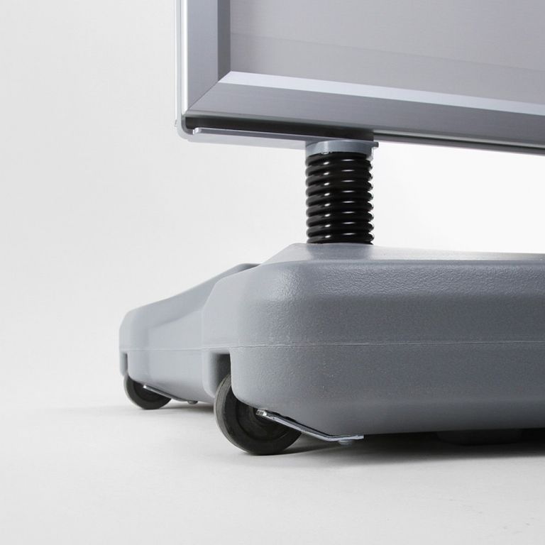 Speziell für Ihre Werbung in windigen Bereichen ist der Kundenstopper WINDTALKER® von Winkler Werbung in Grünberg bei Gießen in Mittelhessen die optimale Lösung. Sein mit Wasser oder Sand befüllbarer Standfuß bietet in Verbindung mit den Spezialfedern aus Stahl eine hohe Standfestigkeit. Für den einfachen Transport sind im Standfuß Rollen integriert. So können Sie den Kundenstopper trotz des Standgewichtes einfach bewegen. Der Aluminium-Schnellwechselrahmen kann doppelseitig mit Plakaten bestückt werden und garantiert Ihnen auch bei hohen Windstärken eine auffällige Werbemöglichkeit.